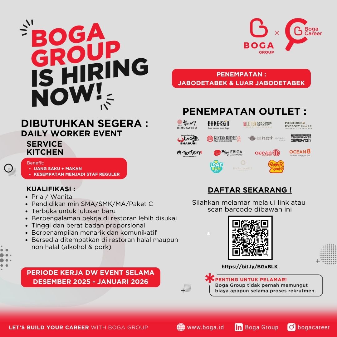 Kami ingin menginformasikan bahwa saat ini BOGA GROUP membuka kesempatan rekrutmen Daily Worker Event (Service & Kitchen).