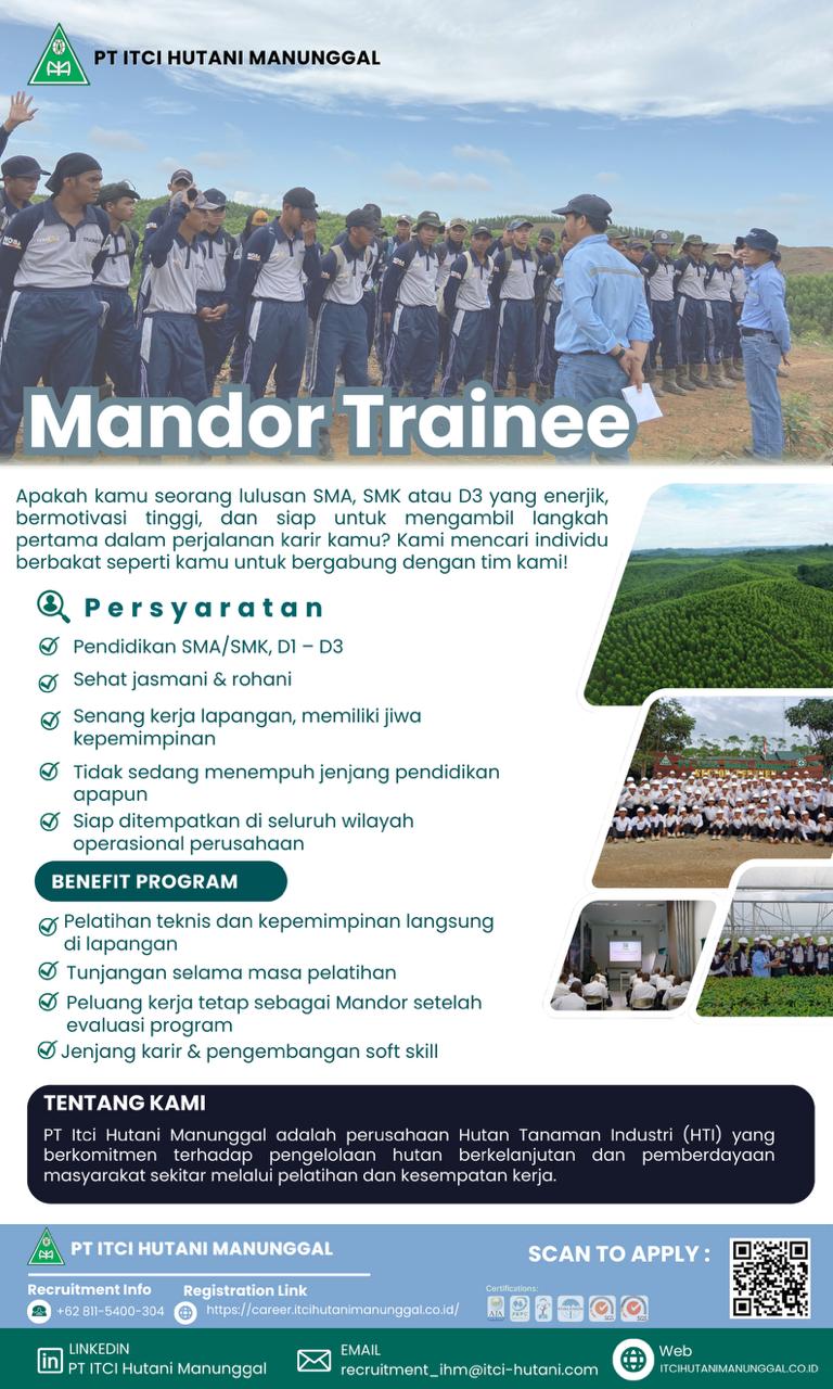 PT Itci Hutani Manunggal is opening opportunities for SMA/SMK and D3 graduates to join Mandor Trainee program. This program offers technical and leadership training in the field, allowances during training period, and opportunity to become a permanent employee after evaluation.