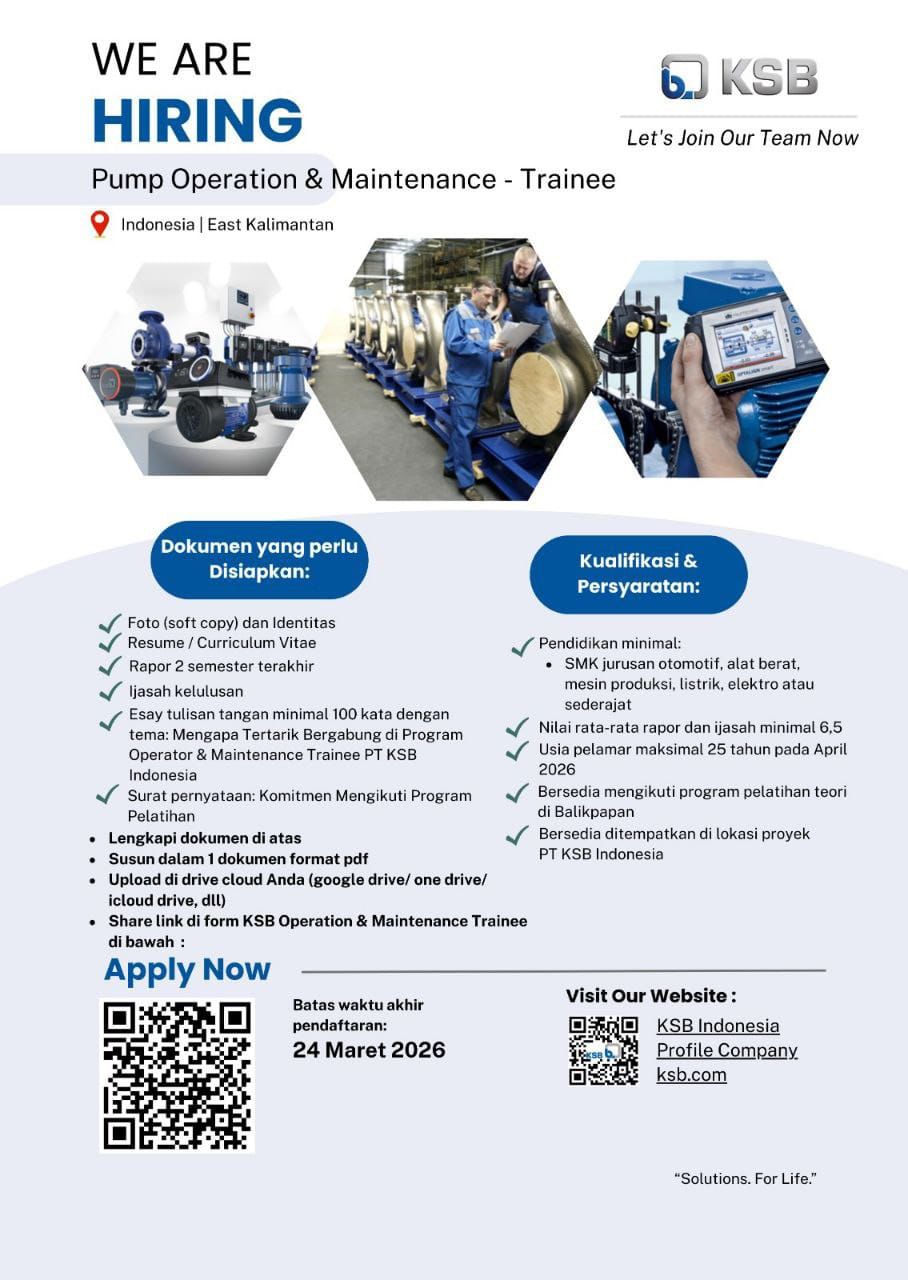 Kami ingin menginformasikan bahwa saat ini PT. KSB INDONESIA membuka kesempatan rekrutmen untuk :