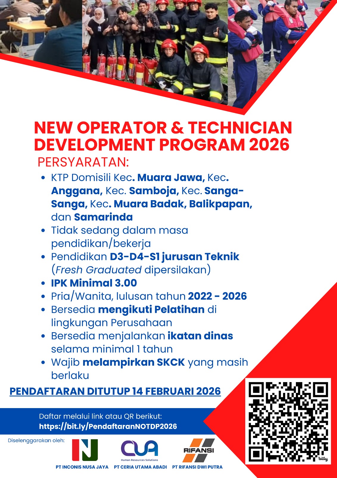 Tiga perusahaan terkemuka : PT. Inconis Nusa Jaya, PT. Ceria Utama Abadi, dan PT. Rifansi Dwi Putra berkolaborasi menyelenggarakan New Operator & Technician Development Program (NTDP) 2026, sebuah program pengembangan SDM muda untuk mencetak tenaga kerja profesional, kompeten, dan siap bersaing di dunia industri.
