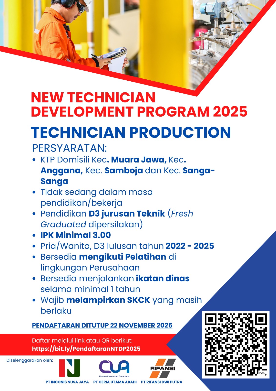 Tiga perusahaan terkemuka : PT. Inconis Nusa Jaya, PT. Ceria Utama Abadi, dan PT. Rifansi Dwi Putra berkolaborasi menyelenggarakan New Technician Development Program (NTDP) 2025, sebuah program pengembangan teknisi muda yang bertujuan mencetak tenaga kerja terampil dan siap berkontribusi di dunia industri.